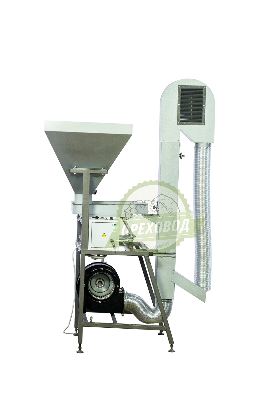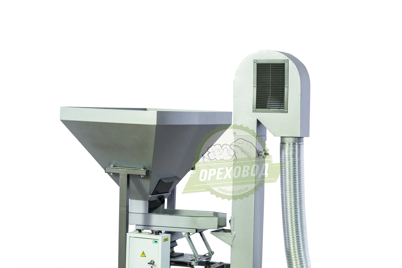 Принцип действия: оператор засыпает колотый орех в бункер и включает установку. С помощью виброподачи орех подается из бункера в аспирационную колону. Поток воздуха выдувает легкие частицы ореха - скорлупу, перегородки, мусор и пыль, а чистое ядро отправляется в отдельную емкость.